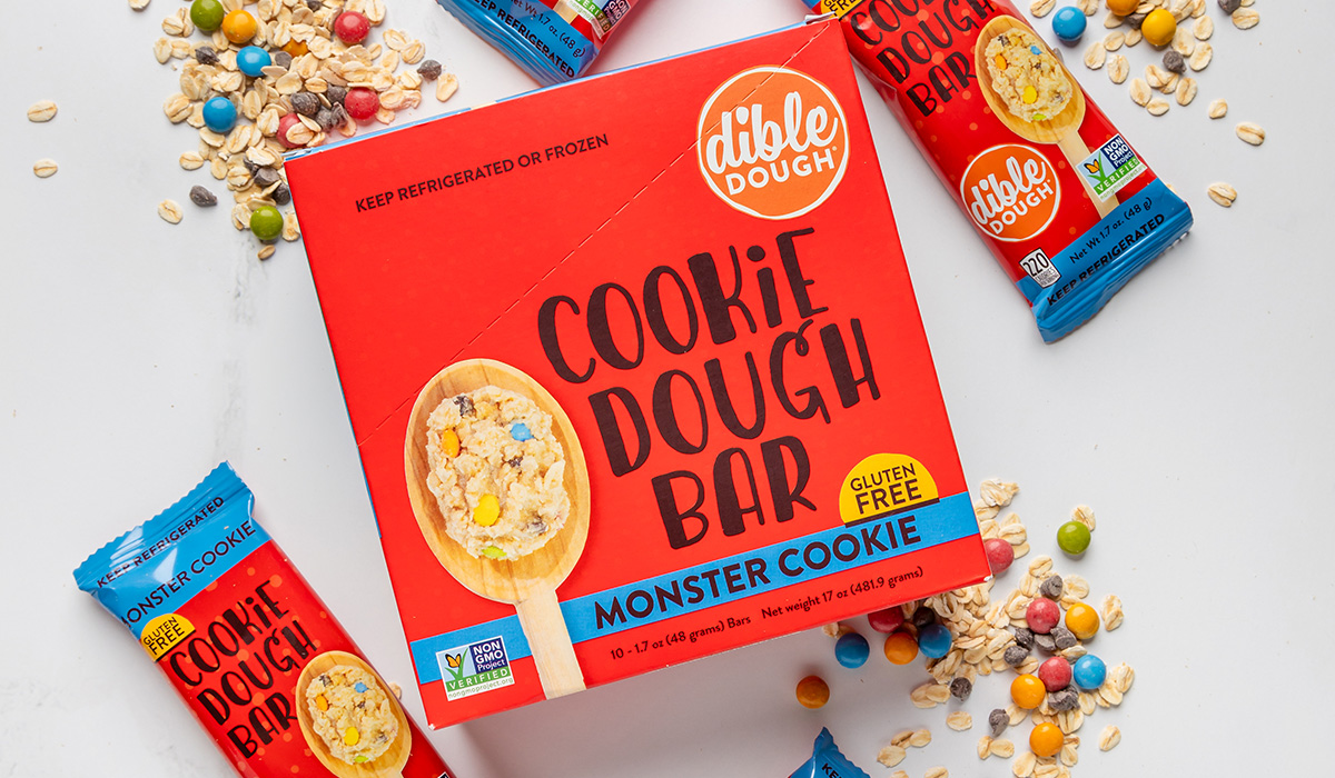Introducing Dible Dough’s very first gluten-free flavor, Monster Cookie Dough Bar. The bar is made with gluten-free oats, creamy peanut butter, rich chocolate chips and crunchy chocolate candies. Monster Cookie Dough Bar is meant to be kept refrigerated and is 48 grams. With bright red packaging, the bar stands out on c-store shelves.