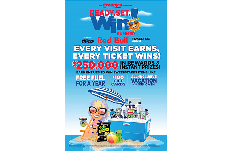 Crosby’s “Ready. Set. Win! Summer” digital game creates excitement with over $250,000 in rewards and prizes customers are eligible to win. Major sponsors include 33 national and local brands, including Red Bull, Fast Twitch and Powerade Zero. Throughout the three-month-plus game, more than 87 community-based Crosby’s convenience stores expect to issue 548,654 tickets to customers. In addition, customers are eligible to win sweepstakes prizes, including: