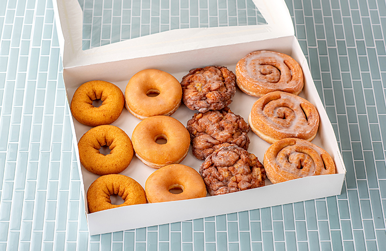 Glazed yeast ring doughnuts come as 48 per case. The glazed cinnamon roll doughnut is made with yeast dough and comes with 32 per case. Glazed apple fritters are made with yeast dough that combines spices and diced apples and come with 32 per case. The plain cake ring doughnut comes as 48 per case.