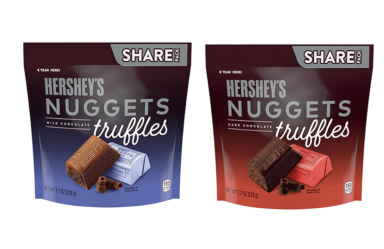 Hershey launched the new Hershey’s Nuggets Chocolate Truffles, which comes in both dark and milk chocolate. Hershey’s Nuggets Dark Chocolate Truffles — which feature red wrapping — are a rich, bite-sized snack that has a thick layer of dark chocolate with truffle filling on the inside. Hershey’s Nuggets Milk Chocolate Truffles — which feature blue wrapping — also feature a thick layer of chocolate and a truffle filling. Both flavors come in a large share pack.